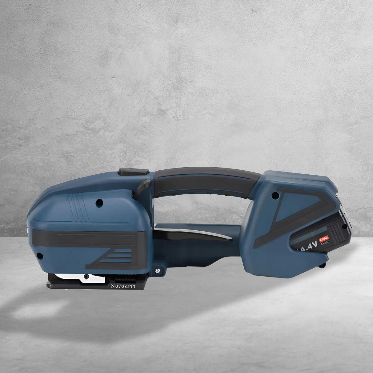Pinza de flejado automático PFE, eficiente sistema 3 en 1, ya que reemplaza los sellos y la pinza selladora y tensora, realizando el proceso de flejado en una sola operación. Incluye 2 baterías (270 operaciones cada una) que se cargan 100% en 90min aproximadamente.