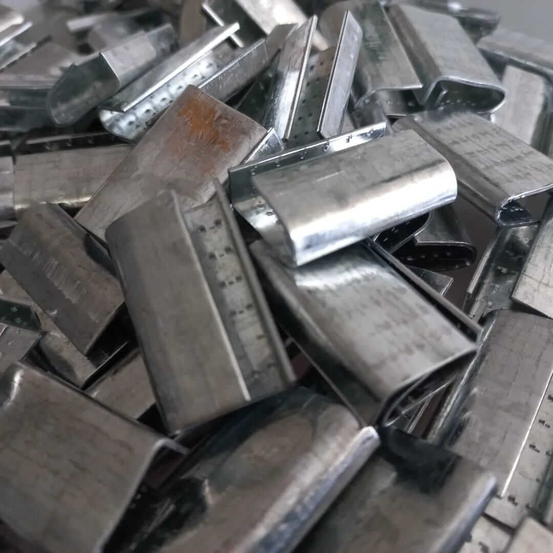 Sellos de chapa para flejes que garantizan una sujeción firme y segura. Apto para sellado de flejes de Poliéster (PET) de uso manual de 16 mm.